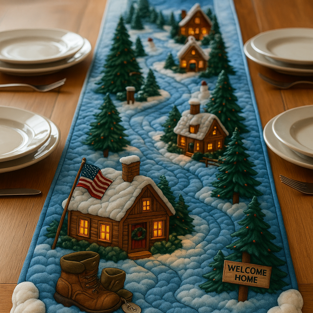 Welcome Home Veteran Winter Village Quilted Table Runner 🇺🇸❄️