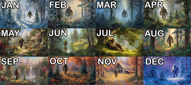 Unique Bigfoot Artwork: Each month highlights a different atmospheric scene featuring the iconic Bigfoot.