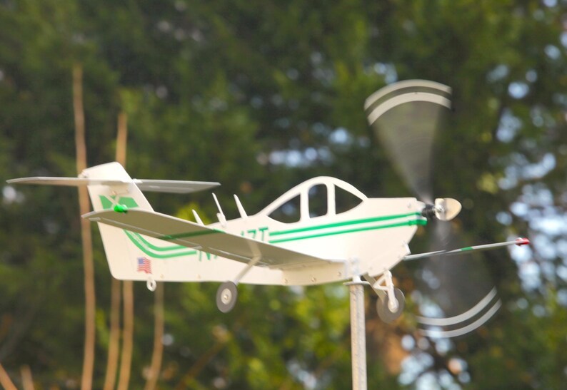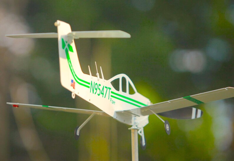 Modeled after the Piper Tomahawk PA-38-112, this handmade aluminum airplane whirligig turns a classic trainer silhouette into kinetic yard art. Built from aircraft-grade 6061 aluminum—hand cut, fabricated, and riveted together—each piece is created with the same care as a small-scale airframe. With a fuselage length of about 23 inches and a wingspan around 22 inches, it has a balanced, true-to-life presence in gardens, flowerbeds, and patio planters. This particular build was commissioned from customer-supplied photos of their full-size aircraft and has been sold, but new versions can be made from your reference photos or from a color scheme and design you describe. Because every one is handmade and the details are continually refined, no two are ever exactly alike. Most customs ship in about 1–2 weeks, and new models are always being added based on customer requests.