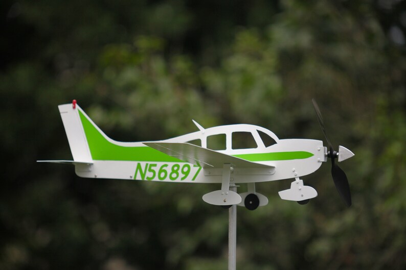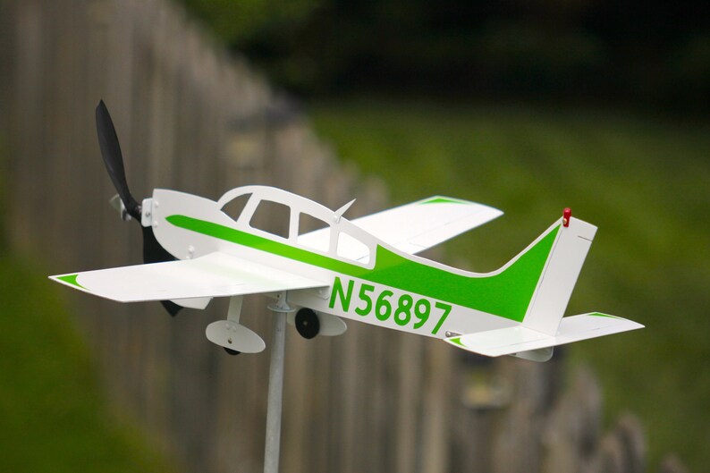 Modeled after the Piper Cherokee PA-28-140, this handmade airplane whirligig transforms a timeless general-aviation silhouette into moving yard art. With a fuselage length of about 22 inches and a wingspan around 20 inches, it’s sized to read clearly in the garden while still fitting naturally into flowerbeds, lawns, and patio planters. The examples shown were customer commissions built from reference photos and have been sold, but your order can be created from your photos or a detailed description—complete with your preferred paint scheme and N-numbers. Because each piece is handmade and the design is continually refined, no two are ever exactly alike; yours will be closely similar, but never an exact duplicate. Most customs take about two weeks to complete and ship.