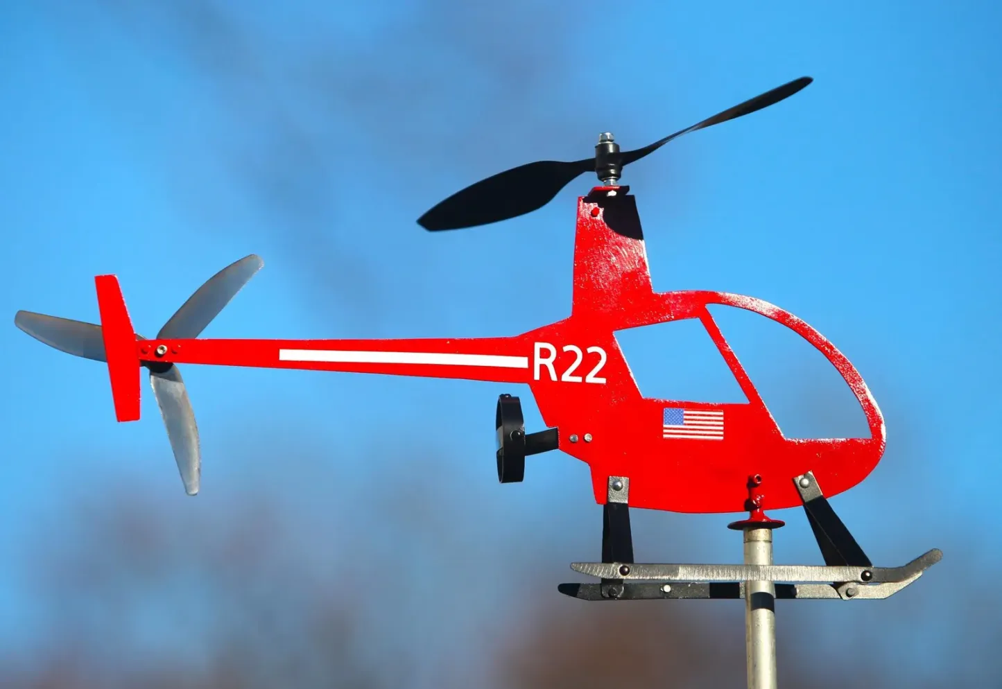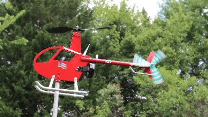 Modeled after the iconic Robinson R22, this helicopter whirligig is a kinetic yard sculpture built from aircraft-grade 6061 aluminum, hand cut and riveted together. Designed for real motion, both the main rotor and tail rotor spin smoothly even in a light breeze, turning your garden wind into an aviation-inspired display. The body is solid aluminum, while the rotors use durable plastic blades fitted with brass bushings for easy, consistent rotation. Each piece mounts on the included pole, and the 18-inch mounting system is designed for flexibility: use the adapter to extend it with standard conduit from a home center, or remove the adapter and screw it directly to a pole, fence, or eave using the pre-made holes. The examples shown have been sold; new builds are made in the single color you choose, typically in 1–2 weeks if not in stock, and will be similar—but never exactly identical—as the design continues to be refined.
