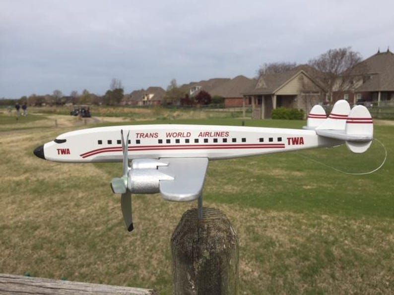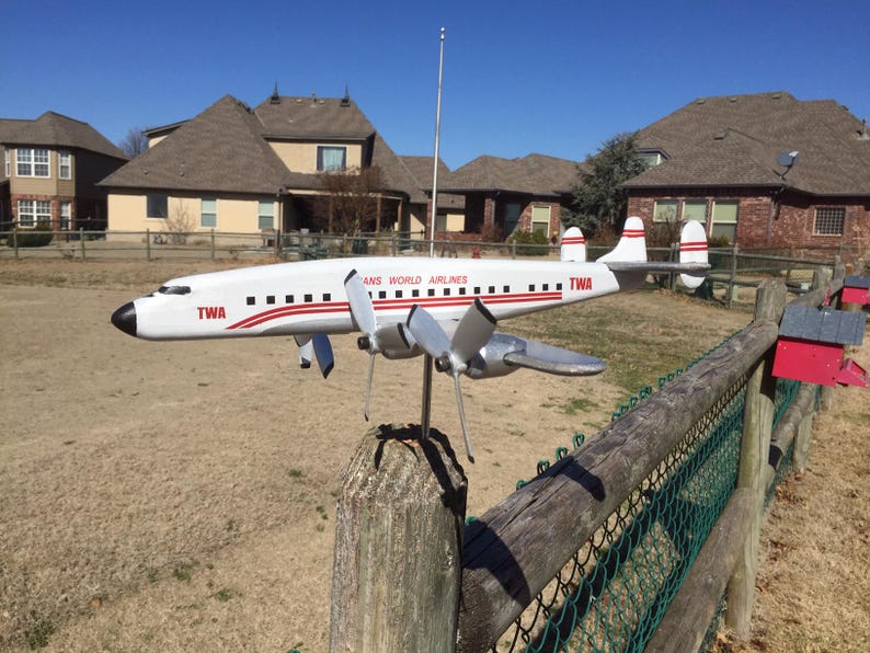 Celebrated as one of the most elegant passenger aircraft of the 1950s, the Lockheed Constellation brought long-range air travel into a new era of style. This wind spinner captures that golden-age silhouette in classic TWA livery—an early launch operator—while nodding to the many airlines that also flew the “Connie.” Crafted from poplar wood, finished in acrylic enamel, and detailed with crisp vinyl striping and lettering, it’s designed to read beautifully even at a distance. Measuring about 16 inches long with a 16-inch wingspan and 4 inches in height, it’s a compact showpiece that comes alive when the wind hits. Mounting is simple and flexible: the spinner includes a 6-inch, 1/4-inch diameter rod that inserts into the fuselage, while the yard stake/post is left to your preferred setup (instructions included for common box-store stakes). For outdoor longevity, each finished piece is coated with Sunguard™ UV protection, with re-coating recommended every 4–6 months for best results.