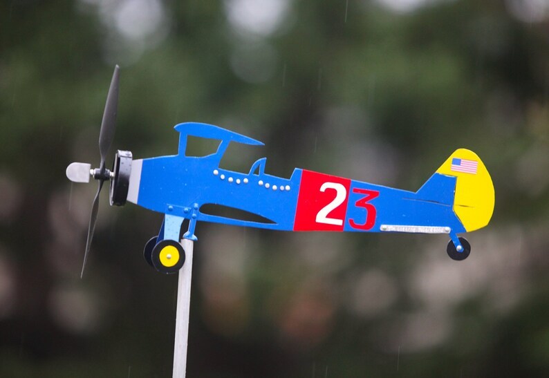 Inspired by the classic Boeing Stearman biplane, this aluminum airplane whirligig brings early aviation charm into the garden. With a fuselage length of about 17 inches, it’s sized to stand out without overpowering your yard display. In the slightest breeze, the propellers begin to spin, turning a simple gust of wind into a moving centerpiece. Each piece comes with a small mounting pole for easy placement in planters, lawns, or flowerbeds, and new builds can be made in the color scheme and number markings of your choice.