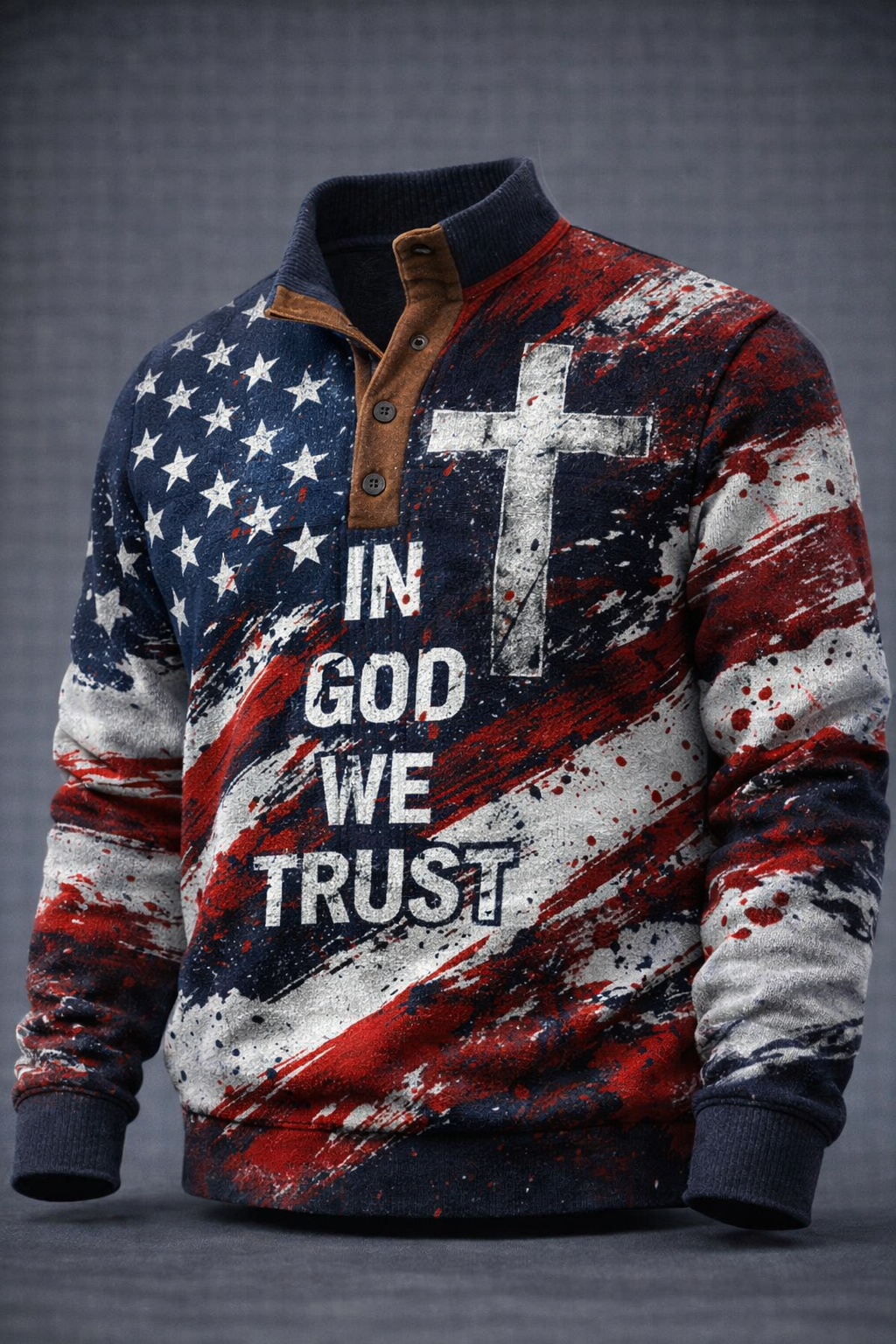 Bold brushstroke graphics inspired by classic American colors are paired with a distressed cross motif, creating a powerful visual statement that feels personal rather than institutional.