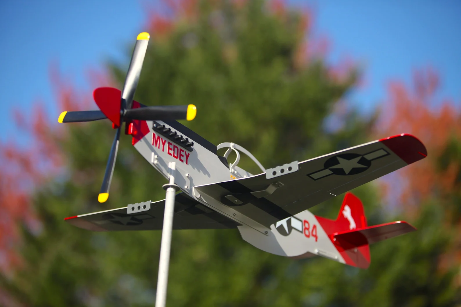“A fighter built for speed and distance. I’ve seen Mustangs suspended in museums, frozen mid-fight — now this one turns with the wind, standing watch over my yard.”This weather vane isn’t just a decorative piece; it’s a tribute to one of the aircraft that defined modern air combat and the pilots who trusted it when everything was on the line.