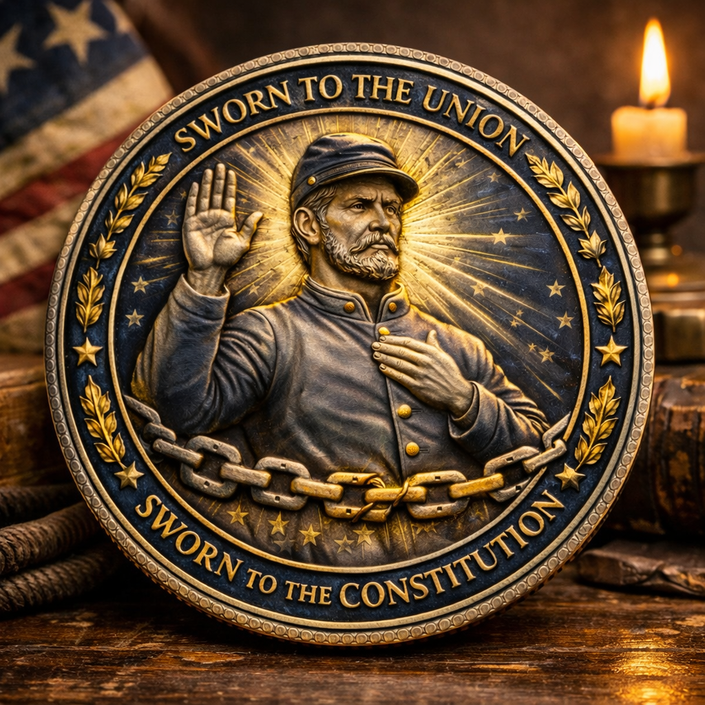 The coin is built around one idea: an oath is more than words. Every element—chains, stars, laurel, map, and stance—echoes duty, sacrifice, and the hard choice to stand on the side of unity when it wasn’t easy or popular.