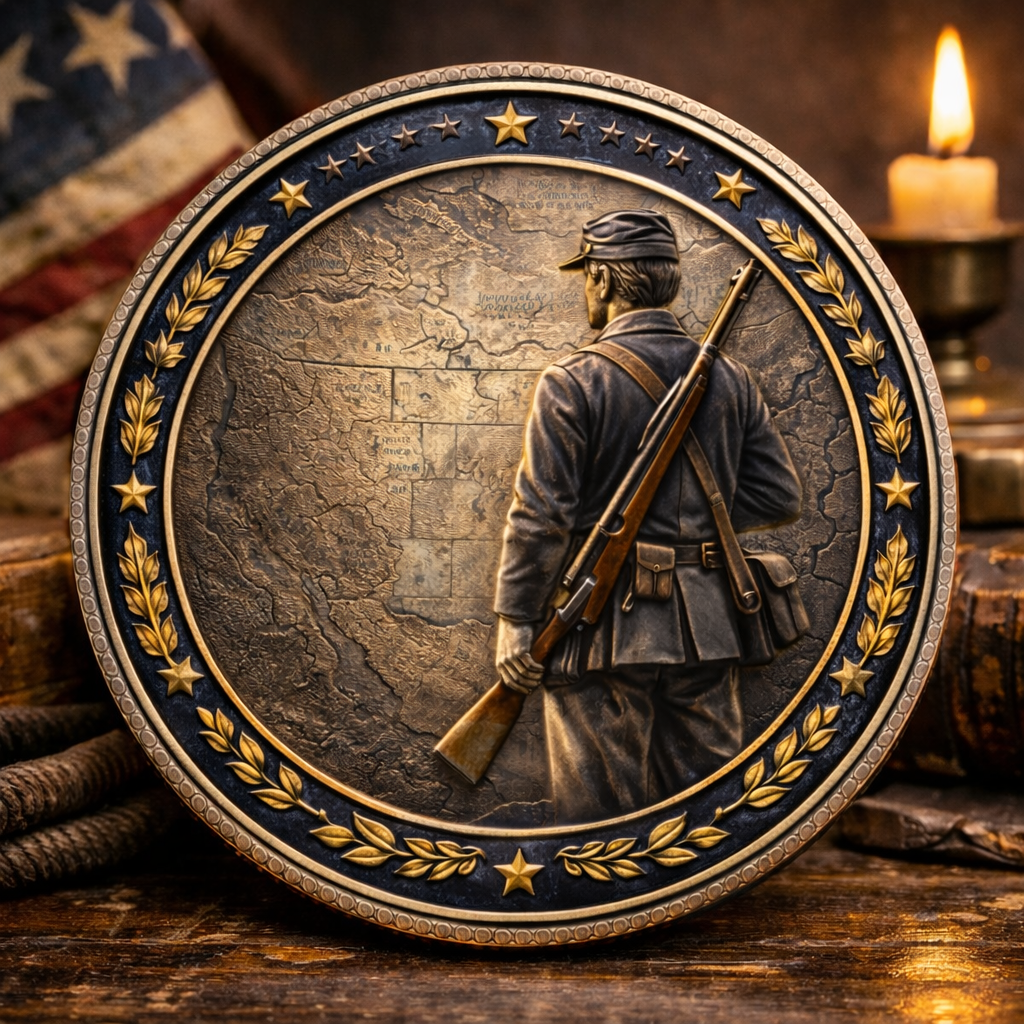This “Sworn to the Union” commemorative coin is designed for people who still feel the weight of the Civil War oath—defend the Union, uphold the Constitution, and carry that promise forward. One side captures the moment of the soldier’s raised hand; the other shows him standing guard over the map of the reunited states. It’s not just a collectible, it’s a small tabletop reminder of what it costs to keep a country together.