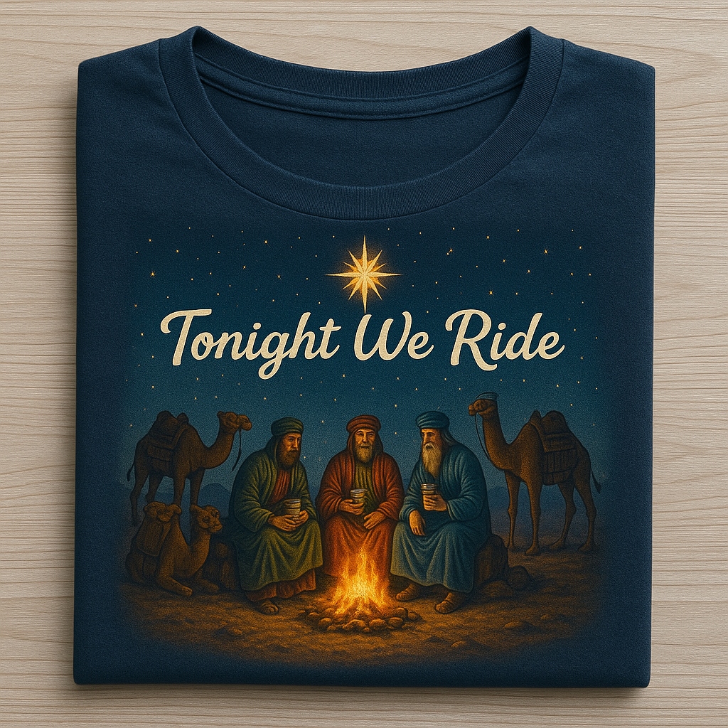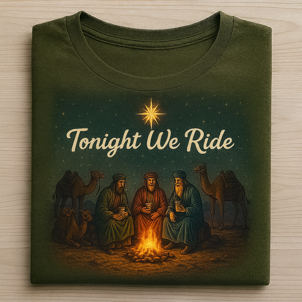 When you wear this tee you are not just wearing holiday art you are wearing the promise that tonight we ride we follow we believe. 🌟