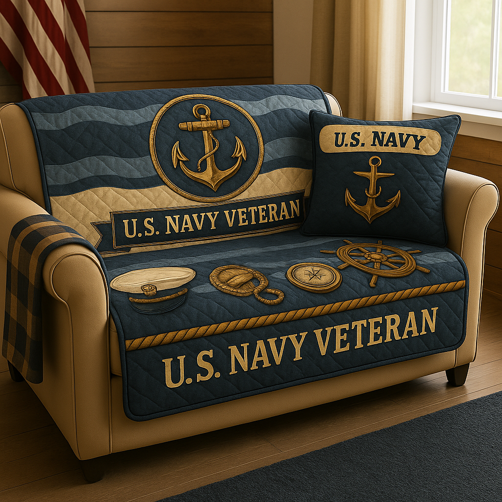 This U.S. Navy Veteran quilted sofa cover brings maritime heritage, warm craftsmanship, and timeless honor into your home.
