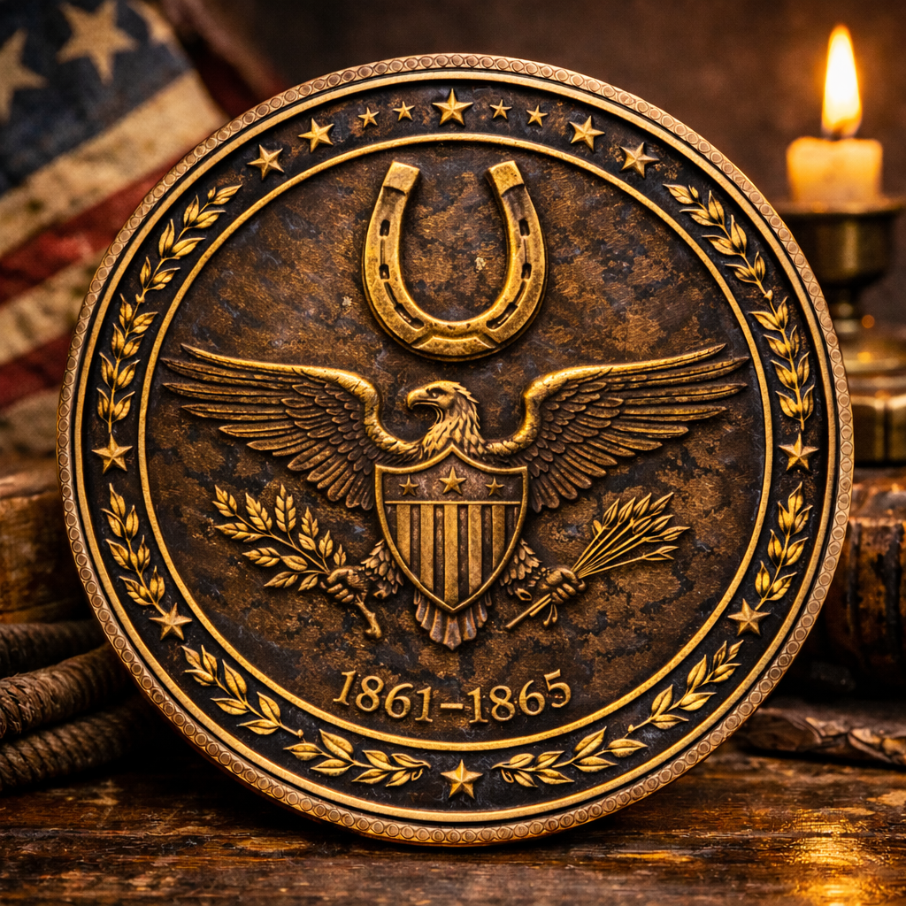 Above the eagle sits a horseshoe, a timeless sign of a rider’s world and a nod to the countless mounts that carried soldiers through mud, rain, and fire. The date 1861–1865 anchors the design at the bottom, so the historical period is always front and center.