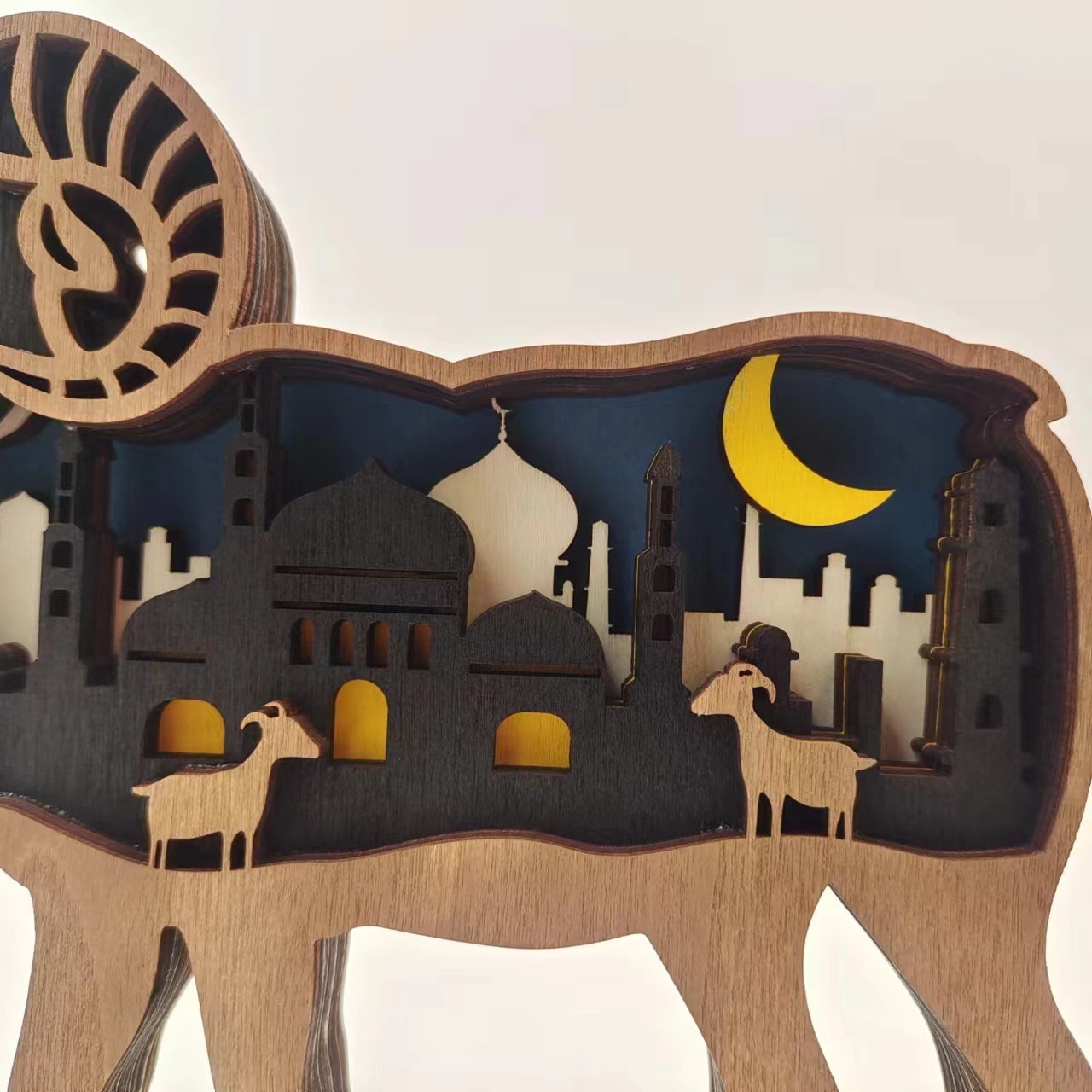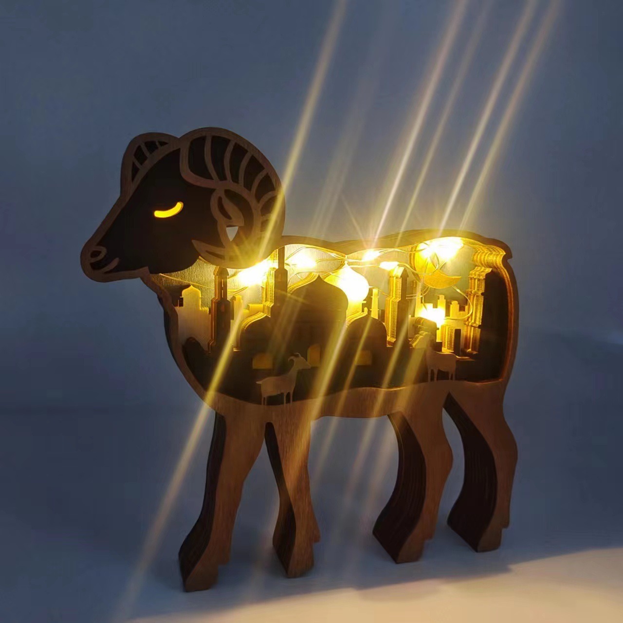 Wooden Ram Light – Handcrafted Eid Decor Lamp with Mosque & Crescent Design
